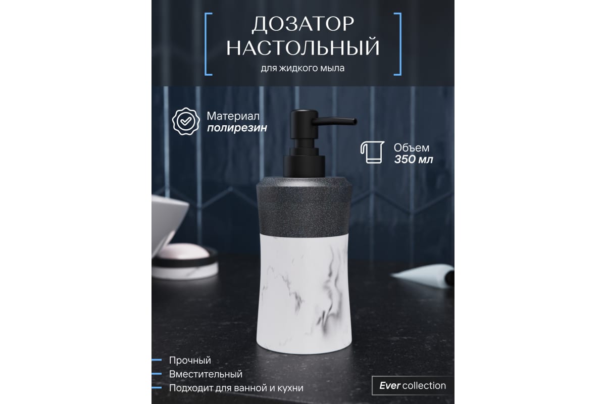 Объем: 0.35 л Материал корпуса: полирезин Поверхность: матовая Цвет корпуса: белый Дозатор 350 мл из полирезина в бело-черном исполнении, ударопрочный, влагостойкий, подходит для кухни и ванной, легко очищается.