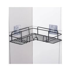 Ярусность: Двухъярусная Тип крепления: Силиконовые держатели Максимальная нагрузка: 10 кг Материал: Сплав металла с полимерным покрытием Цвет: Черный ДxШxВ: 220x220x350 мм Черный матовый цвет подчеркивает изысканность аксессуара, а дополнительные элементы декора придают уникальности общей композиции. Ее можно комбинировать с другими элементами коллекции, но и как отдельный аксессуар угловая полка смотрится идеально. Двухъярусная угловая полка 22 см из металла, черная, стойкая к коррозии, быстрое крепление, современный дизайн, экономия пространства.