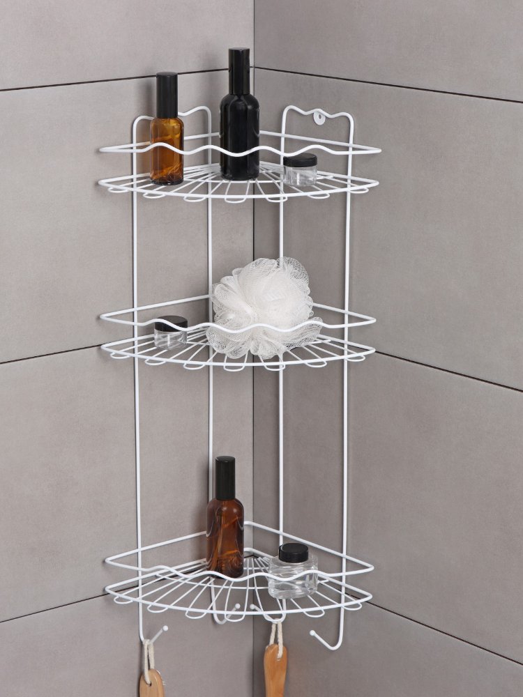 Угловая 3-ярусная полка, 24×24×64 см, влагостойкая, белая, компактная, для хранения в ванной, кухне и других помещениях.
