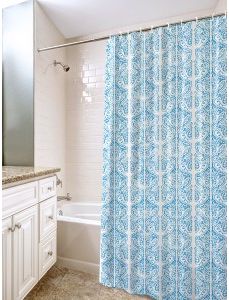 Штора для ванной 1,8х1,8 м в голубом цвете с дизайном "Барокко". Из полиэстера с водоотталкивающей пропиткой, в комплекте кольца для крепления.