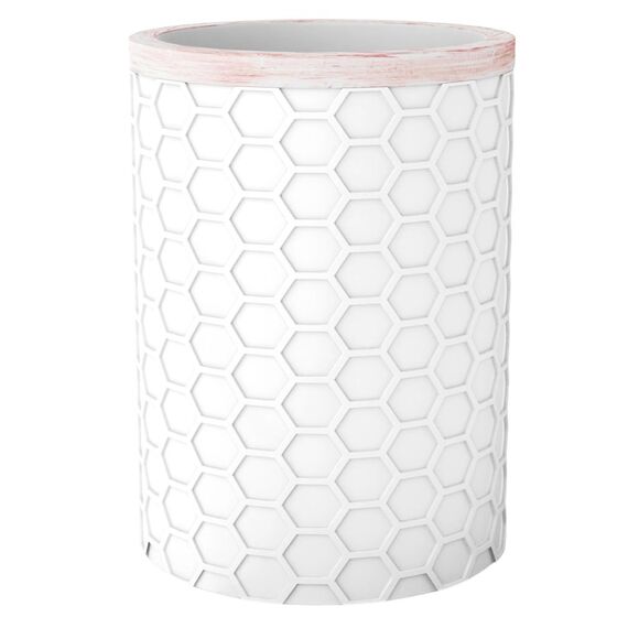 ДxШxВ: 82x82x113 мм Материал корпуса: полирезин Поверхность: матовая Цвет корпуса: белый Белый стакан из полирезина устойчив к влаге и царапинам, подходит для щеток и мелочей, легко моется, стильно украшает ванную.