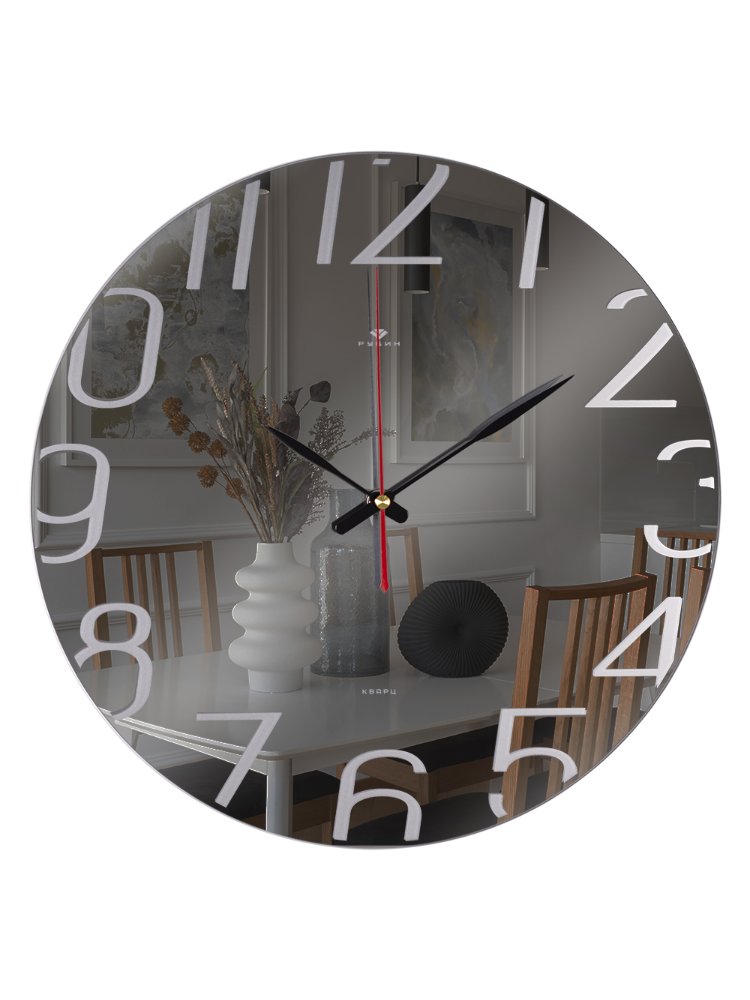- Эффектный зеркальный дизайн делает часы не только функциональными, но и акцентным элементом интерьера.