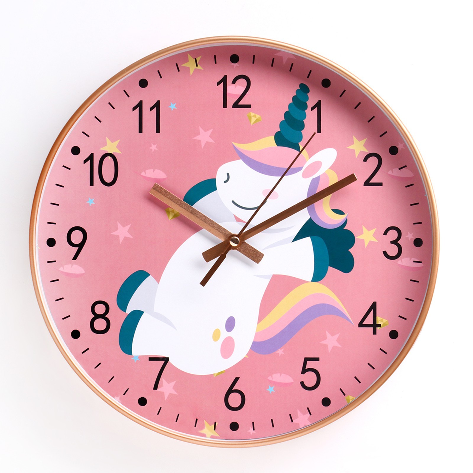 Яркие часы диаметром 30 см с бесшумным механизмом для детских комнат, крупные цифры, прочный корпус, стильный дизайн с единорогом.