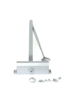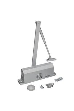 Регулируемый доводчик для дверей 40–65 кг, плавное закрытие, алюминиевый корпус, рабочий диапазон температур — от -35°C до +45°C, серебристый цвет.