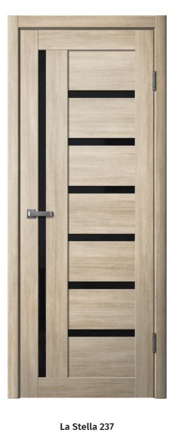 коллекция La Stella.царговая конструкция отличается высокой прочностью и многовариантностью отделки. МДФ наполнение двери обладает достаточно высокой жесткостью и хорошей тепло- и звукоизоляцией. Покрытие двери - Экошпон - защищает ее от высокой влажности и любых механических повреждений Современное межкомнатное полотно 800 мм, ясень латте, с черным стеклом — стиль, прочность, свет и приватность для вашего дома или офиса.