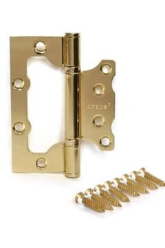 Универсальные накладные петли Apecs из стали, не требующие врезки в дверное полотно. Предназначены для деревянных межкомнатных дверей. Толщина карты 2 мм, высота 100 мм, ширина 63 мм. Макс. вес двери на 2 петли 20 кг. Универсальная стальная петля 100×63×2 мм с золотым антикоррозийным покрытием для долговечной и эстетичной установки дверей без врезки.