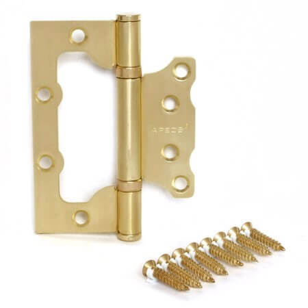 Прочная стальная петля с матовым золотым покрытием для дверей, не требует врезки, обеспечивает лёгкую установку и долговечность в использовании.