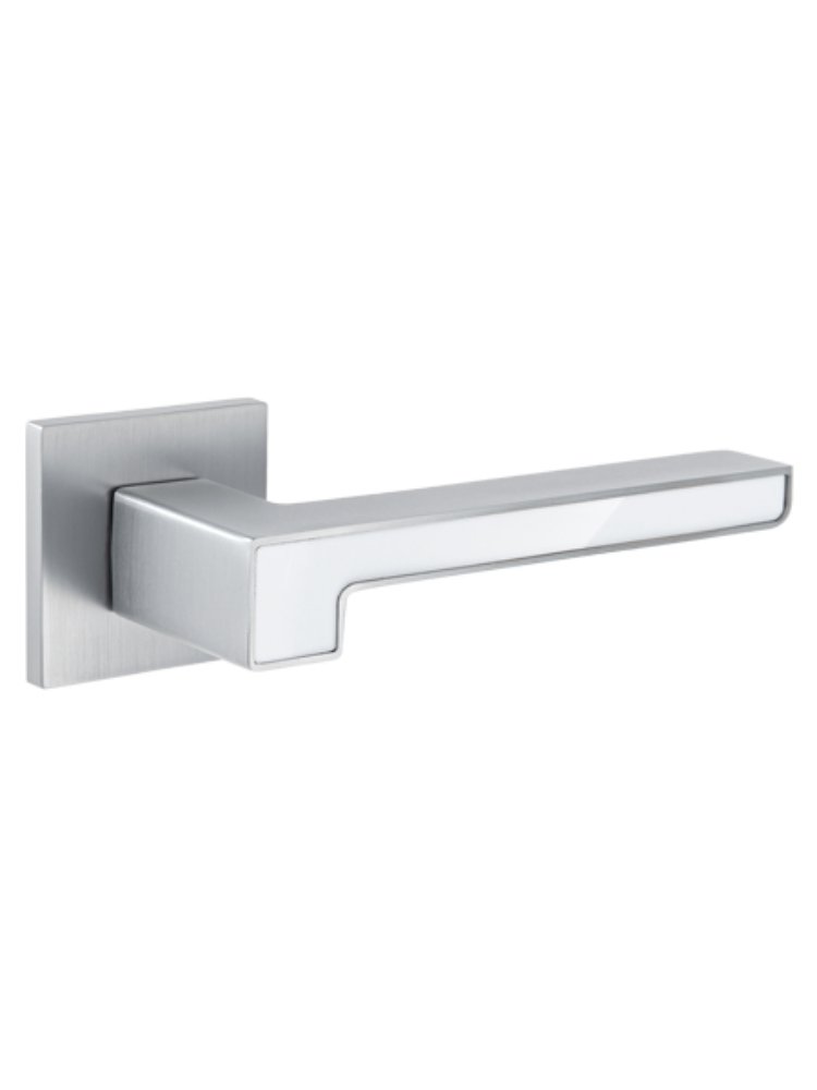 Стильная дверная ручка с сатинированным хромом и белой вставкой, устойчива к царапинам, удобна, универсальна и легко устанавливается.