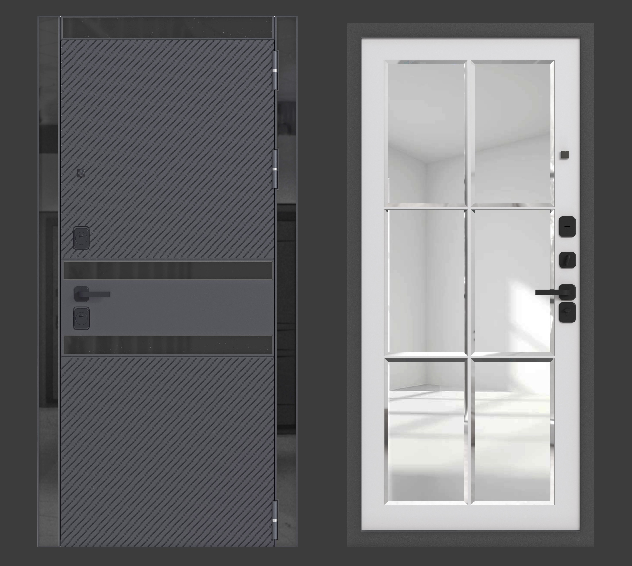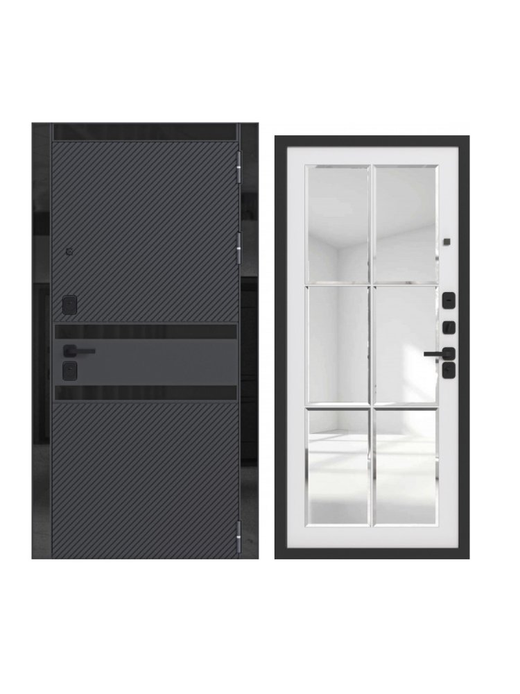 Наличник: МДФ 98 мм., вставки стекло чёрное.Петли: 3 шт., наружные, открывание 180°.Размеры: 960х2050, 860х2050.Ориентация: Правая и левая.Производитель: Россия.Толщина полотна: 90 мм.Глубина коробки: 115 мм.Внешнее покрытие: Порошково-полимерное покрытие Чёрный муар с блёстками. МДФ-панель 16 мм., вставки стекло чёрное с еврокромкой. Цвет: Софт чёрный.Внутреннее покрытие: МДФ-панель 12 мм., зеркало с фацетом. Цвет: Софт белый.Толщина металла: 1,2 мм.Наполнение: Базальтовая плита.Уплотнитель: 3 контура уплотнения.Основной замок: Guardian цилиндровый (ключ-вертушка).Дополнительный замок: Guardian цилиндровый (ключ-ключ).Броненакладка: Есть.Ночная задвижка: Есть.Фурнитура чёрная: Fuaro.