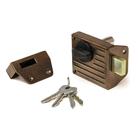 Замок накладной цилиндровый универсальной сторонности 2 класса .Предназначен для установки на деревянные двери толщиной 35-45мм.Возможна установка замка на металлические двери.Замок запирается ключом снаружи иручкой изнутри,имеет блокировку,которая предотвращает открывание дверей снаружи ключом ,число секретов не менне 15000 Универсальный накладной замок с цилиндровым механизмом и стальным корпусом в бронзе, подходит для дверей 35-40 мм, легок в установке и надежен.