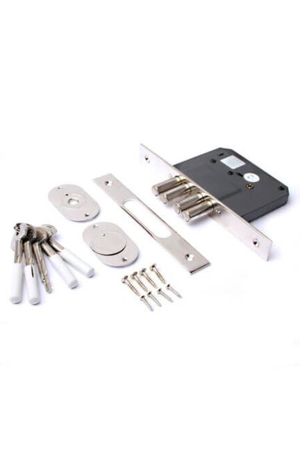 Надежный врезной замок, стальной корпус, хром, для дверей 35–45 мм, универсальный механизм, 3 ключа, высокая взломостойкость и долговечность.