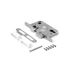 Врезная защелка с фиксатором и металлической защитой, матовый сатин. Надежная, долговечная, подходит для межкомнатных дверей, особенно в ванных комнатах.
