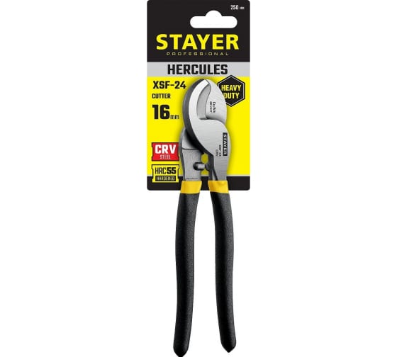 Кабелерез Stayer HERCULES XSF-24, выполнен из углеродистой стали 55. Металл выкован и дополнительно закален токами высокой частоты. Это повышает прочность инструмента. Специальная форма рукоятей снижает нагрузку на запястья, а обливные накладки уменьшают скольжение. Профессиональный кабелерез: резка кабеля до 32 мм, усиленный рычаг, закалённые лезвия, комфортные рукоятки, надёжность и долговечность.