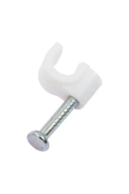 Крепежные скобы круглые 8 мм: прочный пластик, стальной гвоздь, быстро и удобно фиксируют кабель диаметром до 8 мм на любых поверхностях.