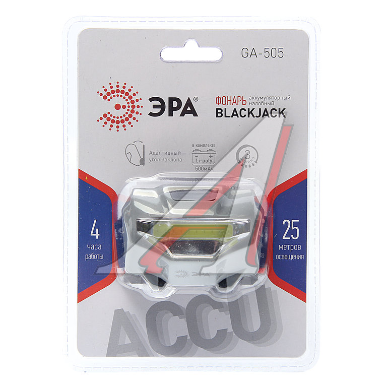 ЭРА GA-505 «Блэкджек» – мощный аккумуляторный налобник для работы, походов, бытовых дел. Новый светодиодный налобный фонарь от торговой марки ЭРА работает в 3 режимах: максимальная яркость, 50% яркости и аварийное мигание. Яркая светодиодная плата создает широкое заливающее освещение. Максимальная дальность – 25 метров. Наклонный корпус позволяет регулировать угол освещения в зависимости от выполняемых работ. Благодаря прочному эластичному ремешку налобный LED-фонарь отлично держится на голове. Корпус из легкого прочного пластика. Удобная кнопка включения. В основе фонаря налобного – современные светодиоды последнего поколения. Емкий литиевый аккумулятор позволяет фонарю светить без перерыва 4 часа. Налобник хорошо работает как в мороз (-20С°), так и в жару (+45С°). Имеет аккуратный универсальный дизайн и компактные размеры. Удобный в применении, долговечный, яркий налобник на все случаи жизни. Яркий COB-фонарь 3 Вт с аккумулятором, тремя режимами и регулировкой наклона — для строительства, ремонта и монтажа