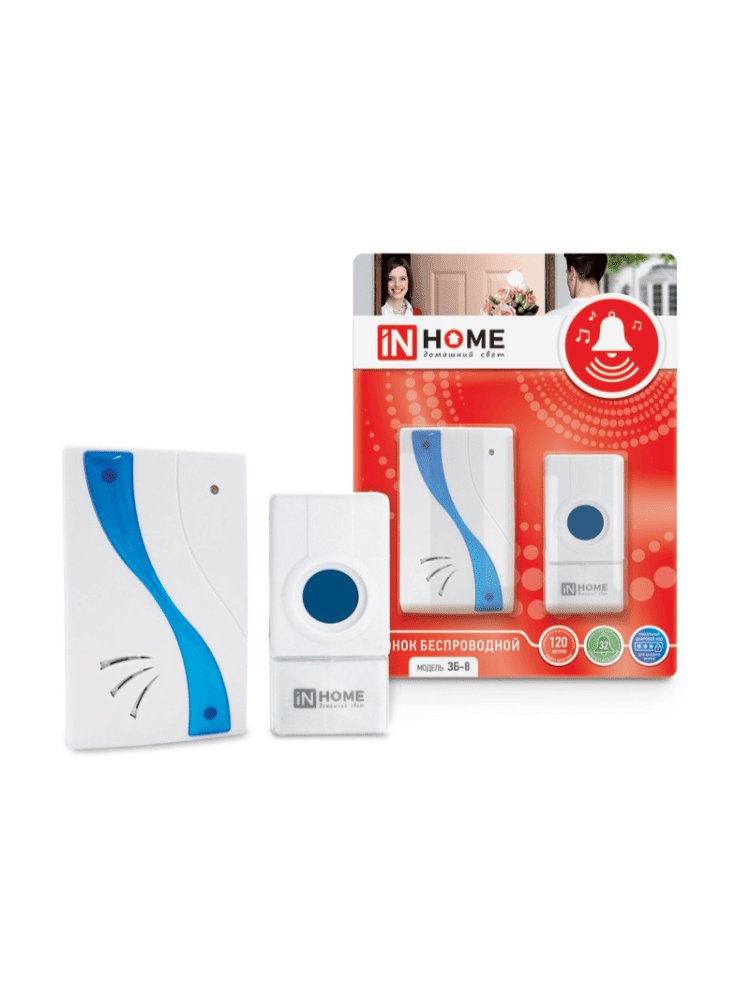 Звонок беспроводной ЗБ-8 32 мелодии 120м с цифр. кодир. с кнопкой IP44 БЕЛО-ГОЛУБОЙ IN HOME