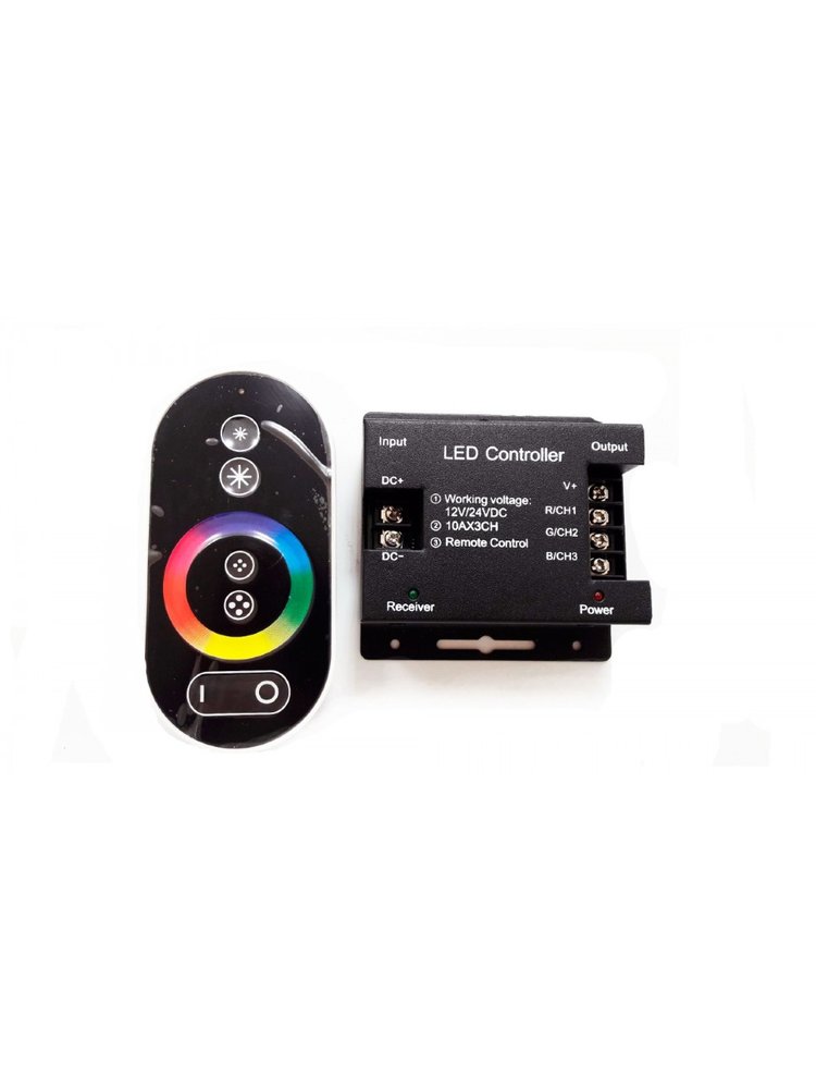 Сенсорный RGB контроллер 10Ах3, 12–24В, музыкальный режим, синхронизация со звуком, управление светодиодными лентами, высокая мощность.