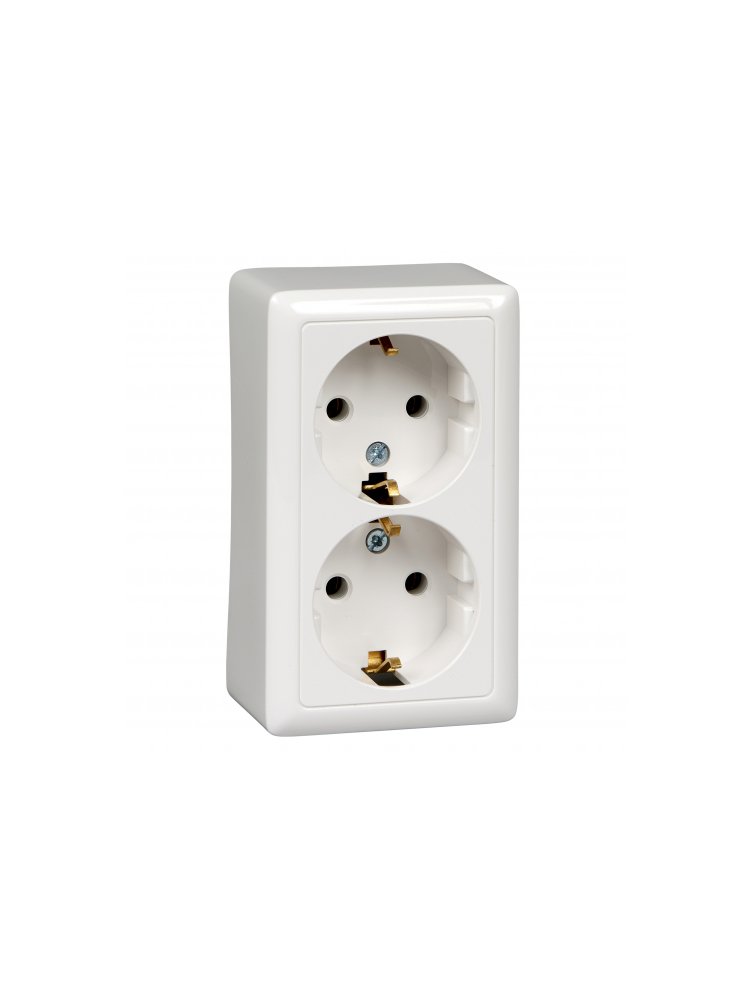 Две розетки с заземлением, корпус из прочного пластика, удобный наружный монтаж и надежная защита для подключения электрических приборов.