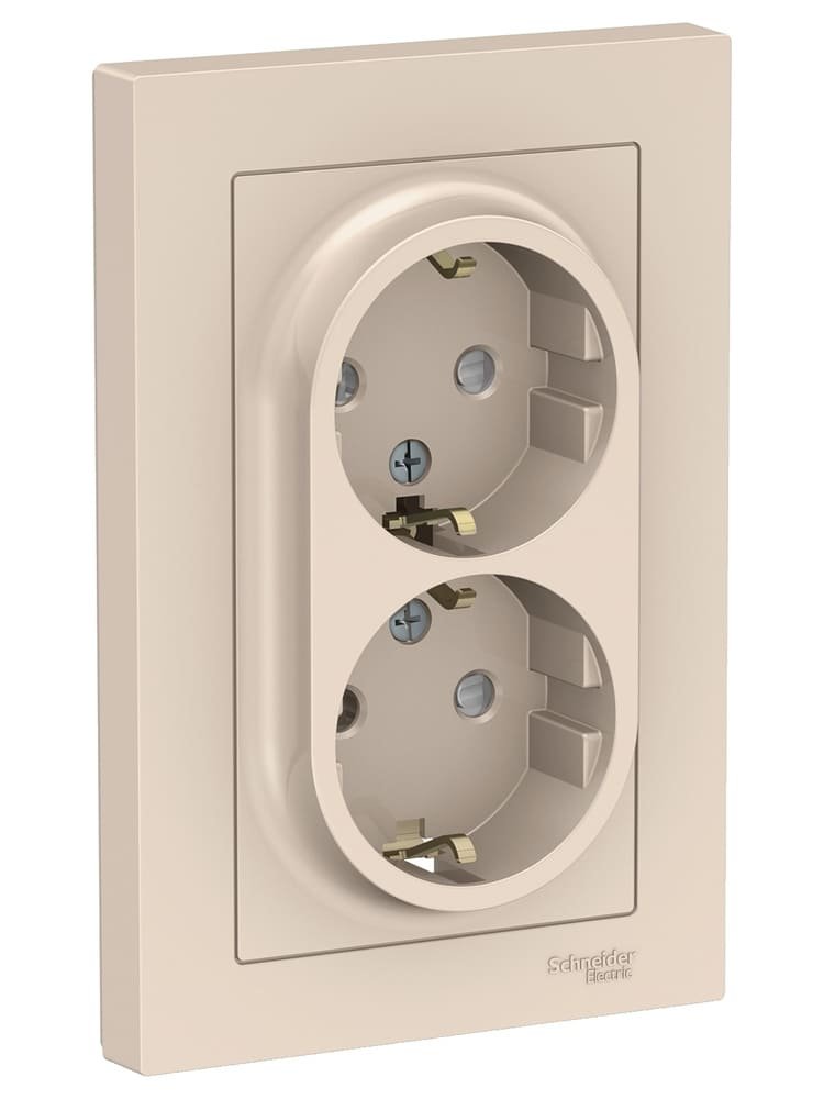 Двойная розетка 16А с заземлением и шторками, безопасная, универсальная, бежевый цвет. Идеальна для дома и офиса. Легкий монтаж и долговечность.