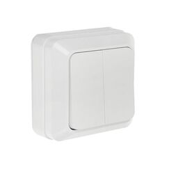 Двухклавишный выключатель, наружный монтаж, 10А, белый, устойчив к износу, легко монтируется, подходит для дома и офиса.