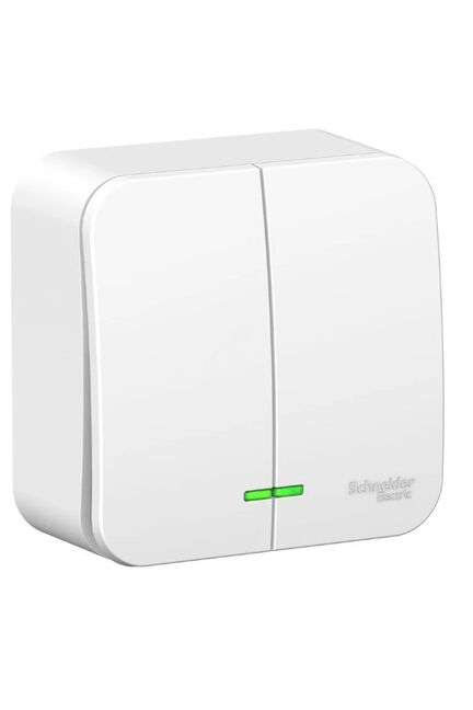 2-клавишный выключатель с подсветкой, изолирующей пластиной, ток до 10А, монтаж накладной, белый. Безопасность и удобство управления светом.