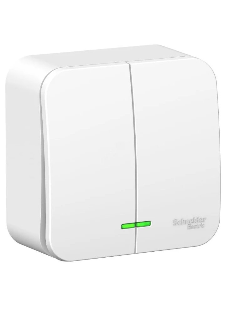 2-клавишный выключатель с подсветкой, изолирующей пластиной, ток до 10А, монтаж накладной, белый. Безопасность и удобство управления светом.