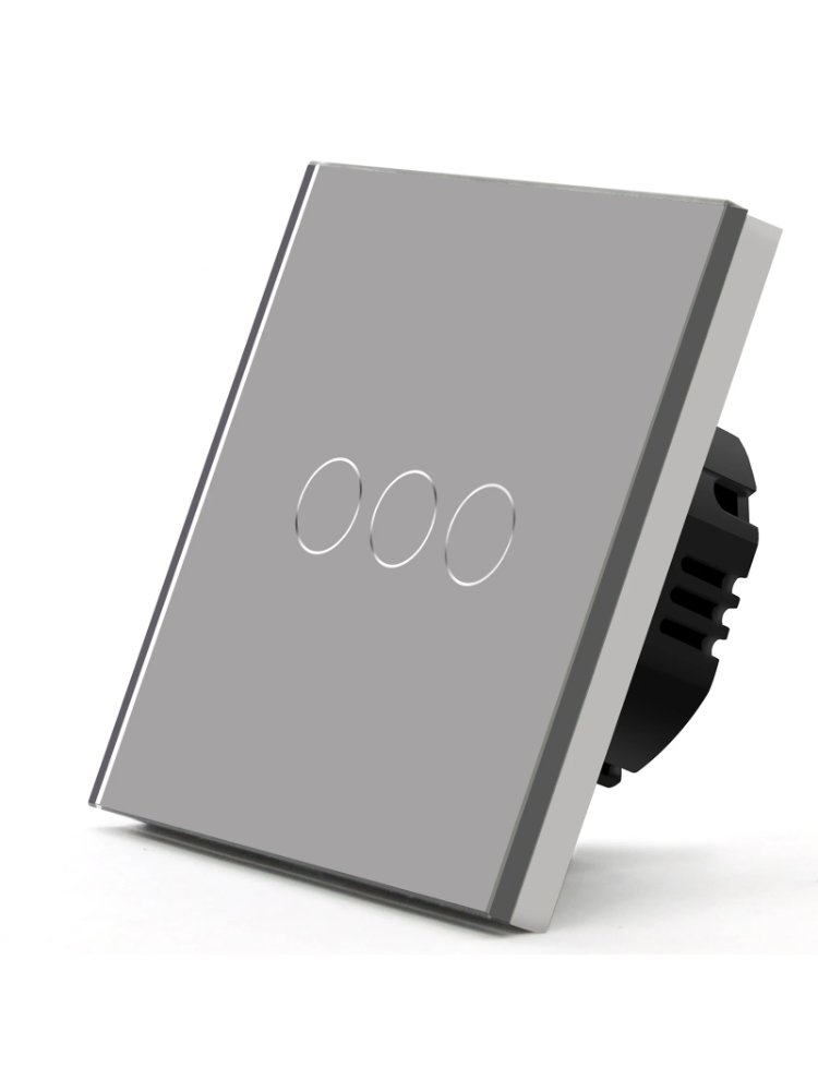 Трёхканальный сенсорный выключатель с программируемыми режимами, серый цвет, подходит для современных интерьеров и умного управления освещением.