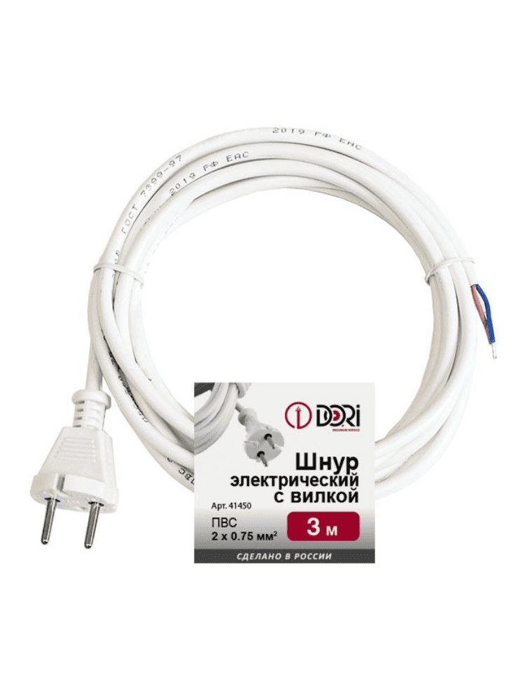 Шнур с вилкой 3м белый ПВС 2*0,75 в Амурск