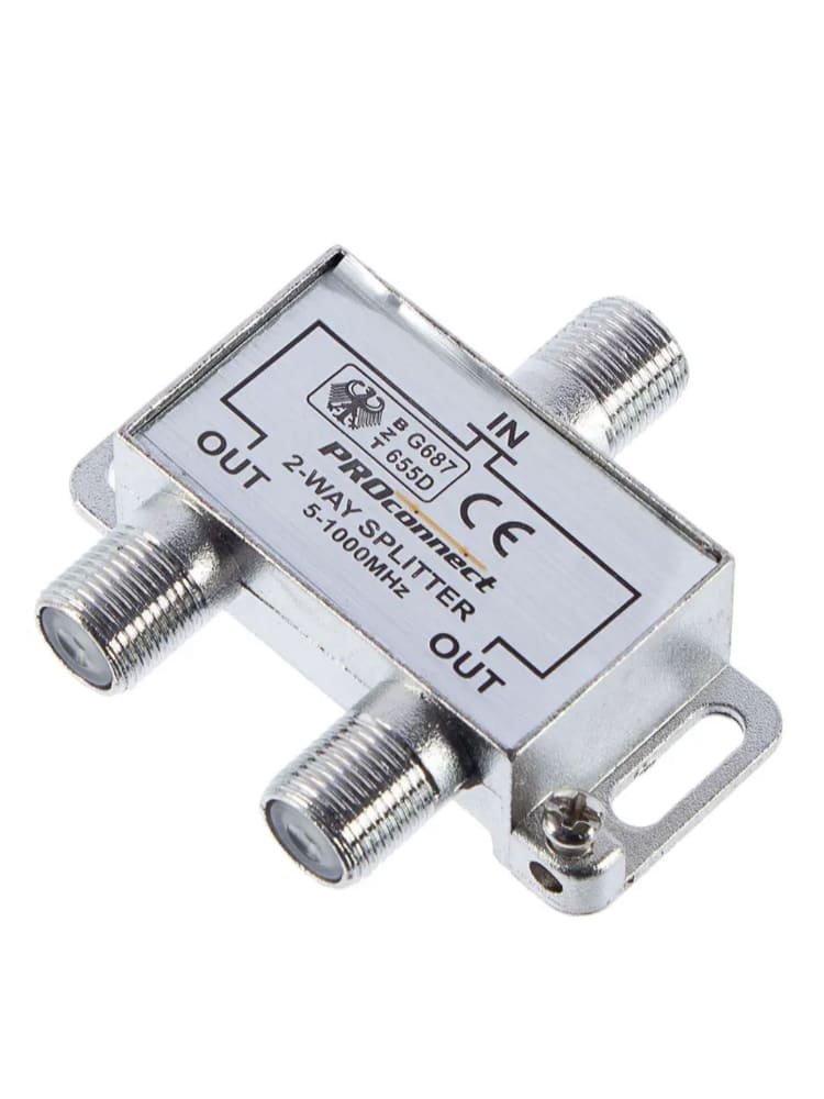 Разветвитель на 2 ТВ (5–1000 МГц) на разъемах F, минимальные потери сигнала, удобен для цифрового и аналогового телевидения, прост в установке.