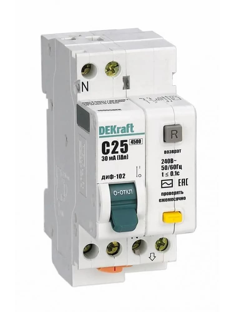 Надежная дифференциальная защита на 25А, 30мА для однофазных сетей, предотвращает утечки, перегрузки и короткие замыкания, простая установка.