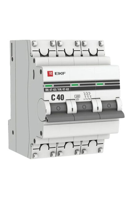 Автомат 3P 40A (C) 4,5кА BA 47-63 EKF PROxima - надежный 3-полюсный выключатель с отключающей способностью 4,5 кА для защиты сетей от перегрузок и КЗ.
