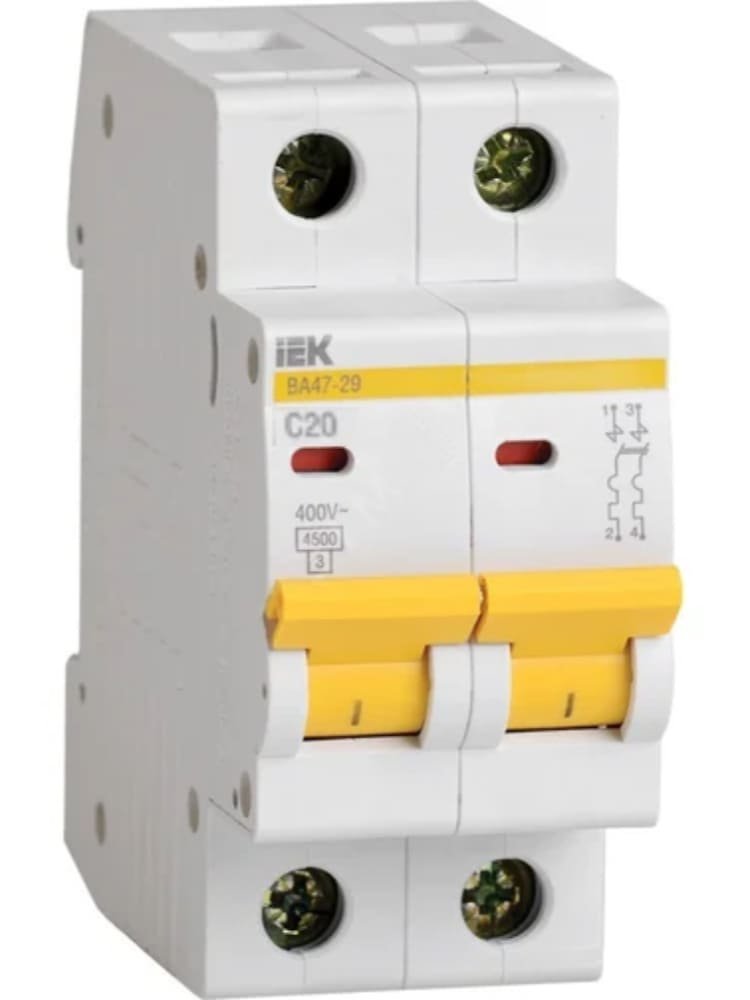 Двухполюсный автоматический выключатель рассчитан на номинальный ток 20А и способен отключать короткие замыкания с током до 4,5кА. Характеристика C обеспечивает оптимальную защиту электрических цепей от перегрузок и сверхтоков, а компактный корпус облегчает монтаж на стандартную DIN-рейку. Корпус выполнен из негорючих материалов, оснащён удобным рычагом включения/отключения. Контактная система гарантирует стабильную работу даже при частых коммутациях.
