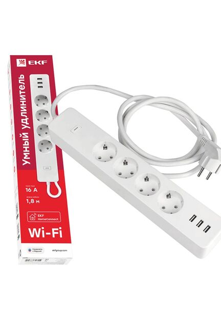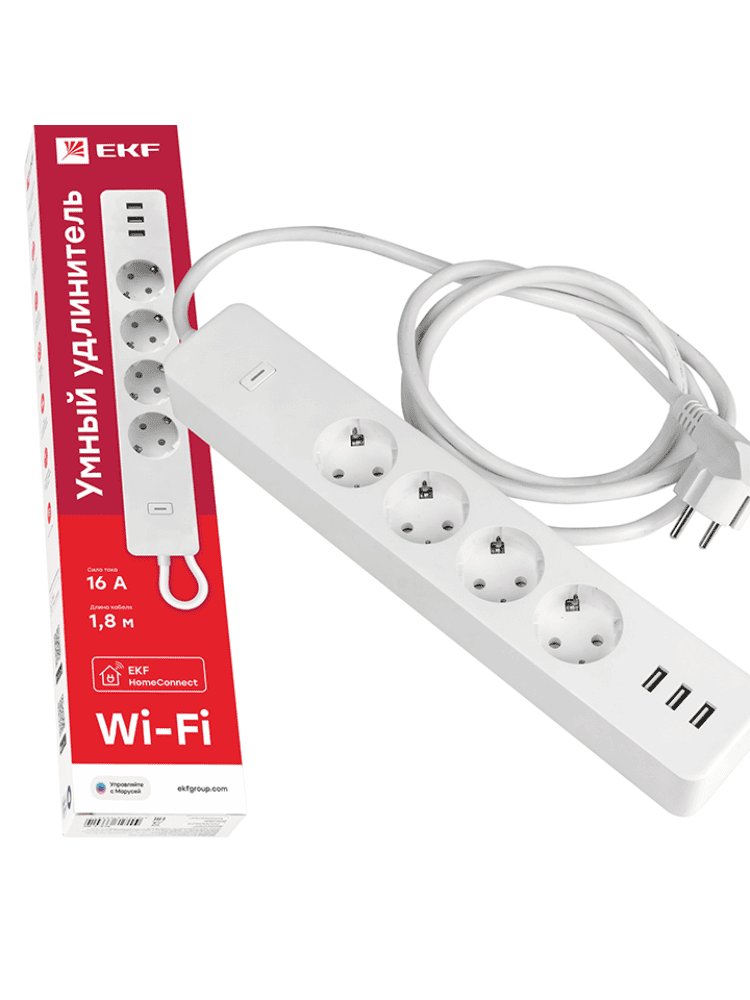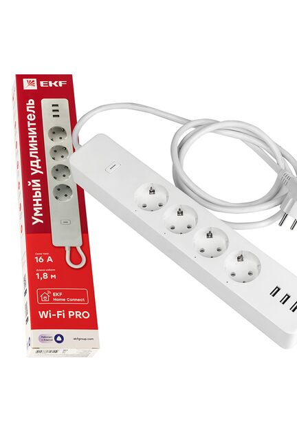 Умный удлинитель EKF Connect Pro поможет сделать обычные приборы умными. При помощи приложения EKF Connect для Android и iOS, а также при помощи голосовых помощников Алиса от Яндекса, Маруся от VK и Салют от Сбера можно управлять светильниками, вентиляторами, обогревателями, увлажнителями и любыми другими приборами, которые начинают работать сразу же при подаче напряжения. Версия Pro поддерживает индивидуальное управление каждой розеткой, а также позволяет измерять напряжение, силу тока, мощность, и собирать статистику энергопотребления по дням и месяцам. Кроме 4 розеток есть ещё 3 порта USB для зарядки мобильных устройств.