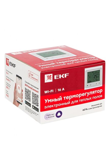 Умный термостат EKF Connect для электрического тёплого пола позволяет выставлять температуру как на самом устройстве, так и из приложения EKF Connect или через голосового помощника от Яндекса — Алису. Можно включать тёплый пол по расписанию. У термостата два датчика температуры: встроенный датчик температуры воздуха и выносной датчик температуры пола. Также есть функция антизамерзания, которая включит тёплый пол, если температура опустится ниже 5 градусов, и функция определения открытого окна, которая отключит тёплый пол на время проветривания, чтобы не тратить энергию зря. Умный термостат делает дом более комфортным и экономит электроэнергию. Умное управление климатом через Wi-Fi, точный контроль температуры, программируемые режимы и установка в стандартный подрозетник.