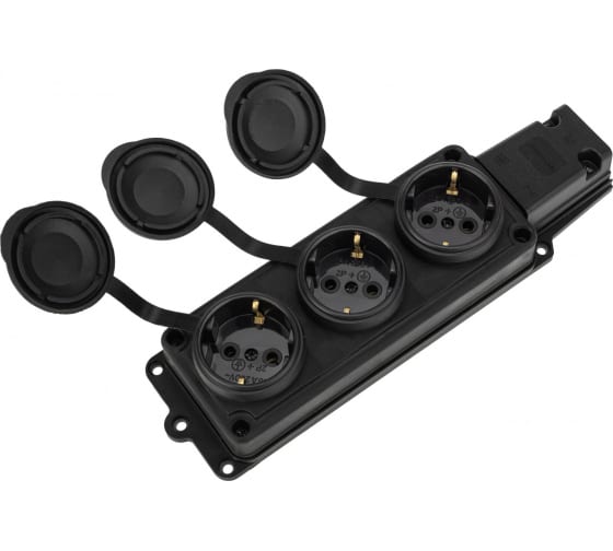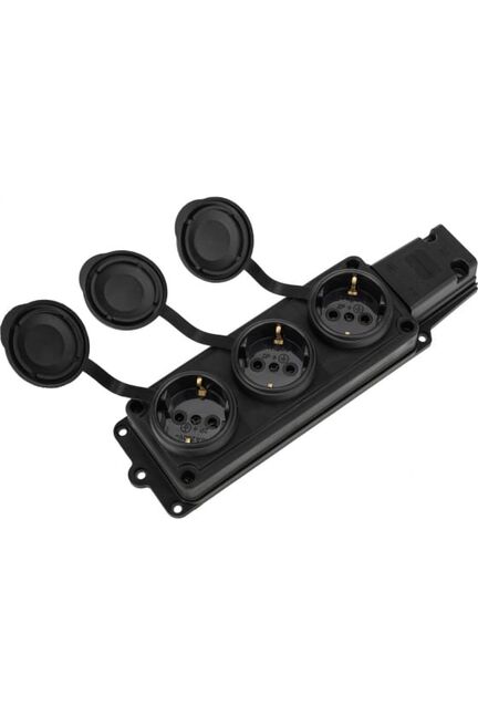 Тройная каучуковая розетка, 16А, IP44, с заглушками и заземлением — для безопасного подключения техники в условиях влаги и пыли.