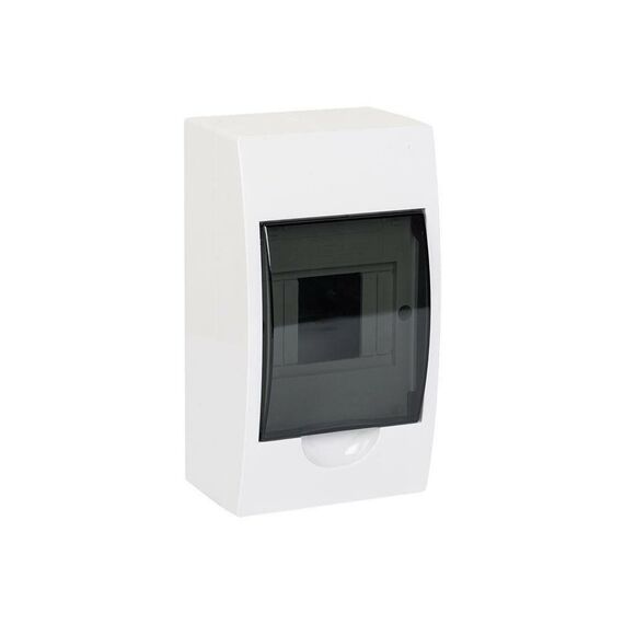 Навесной бокс на 4 модуля с прочным пластиковым корпусом, черной прозрачной дверцей и степенью защиты IP41 для безопасного размещения автоматики.