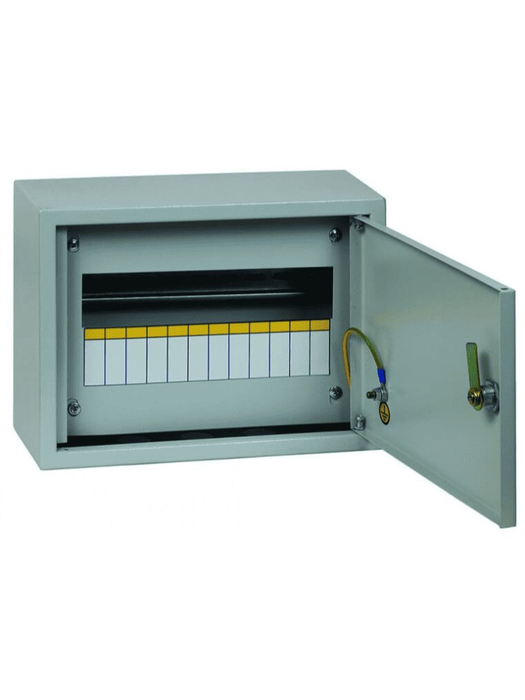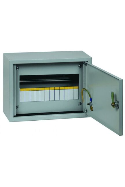 Щит на 12 модулей с местом для 3-фазного счетчика, надежный металлический корпус, степень защиты IP31 — для безопасной организации электросети.