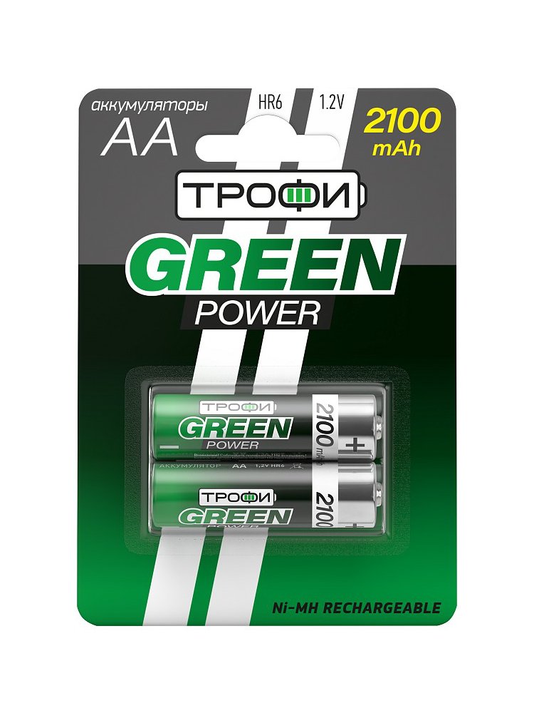 Батарейка Трофи аккумуляторная HR6-2BL 2100 mAh GREEN POWER NiMH блистер 2 (AA)
