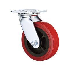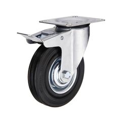 Применяется для транспортировки грузов средней степени тяжести. Колесо поворотной опоры оснащено роликовым подшипником. Данная серия колесных опор отлично адаптирована к эксплуатированию в помещениях и на грубой уличной поверхности. Обод поворотного колеса изготовлен из высокопрочной стали и оцинкован. Сама шина колеса выполнена из черной резины высокого качества, которая справляется с различными воздействиями внешней среды и поглощает вибрации и шум. Рекомендуемая скорость транспортировки груза на тележке с данным видом колес не более 4 км/ч. Заводской температурный режим для данной серии варьируется между -25С° и +50С°. В качестве крепления использована площадка. Тормоз, предусмотренный конструкцией, в случае необходимости обеспечивает неподвижность конструкции. Используются для складских тележек, платформенных тележек, мусорных баков небольшой емкости, для строительных лесов, стеллажей, железной мебели. Поворотная колесная опора 125 мм с тормозом выдерживает до 100 кг, устойчива к износу, легко фиксируется