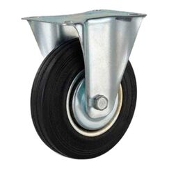 Колеса промышленные неповоротные состоят из колеса (обод – металл, шинка – черная резина) и фиксированной опоры с площадочным креплением. Отличительная особенность – прямолинейная траектория движения. Температурные условия: от -20° до + 60°. Рабочая среда: помещение и открытый воздух. Основные сильные стороны: простота механизма; долговечность; широкая распространенность, обеспечивающая доступность замены. Фиксированные колесные опоры применяются в складской, строительной, бытовой и других сферах в качестве устройств передвижения. Используются для складских тележек, платформенных тележек, мусорных баков небольшой емкости, для строительных лесов, стеллажей, железной мебели. Колесо 125 мм, до 100 кг, оцинкованный корпус, неповоротная — для устойчивого и плавного передвижения оборудования и мебели на стройплощадке и складе.