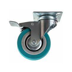 Применяется для транспортировки грузов средней степени тяжести. Колесо поворотной опоры оснащено роликовым подшипником. Данная серия колесных опор отлично адаптирована к эксплуатированию в помещениях и на грубой уличной поверхности. Обод поворотного колеса изготовлен из высокопрочной стали и оцинкован. Сама шина колеса выполнена из черной резины высокого качества, которая справляется с различными воздействиями внешней среды и поглощает вибрации и шум. Рекомендуемая скорость транспортировки груза на тележке с данным видом колес не более 4 км/ч. Заводской температурный режим для данной серии варьируется между -25С° и +50С°. В качестве крепления использована площадка. Тормоз, предусмотренный конструкцией, в случае необходимости обеспечивает неподвижность конструкции. Используются для складских тележек, платформенных тележек, мусорных баков небольшой емкости, для строительных лесов, стеллажей, железной мебели. Поворотная колесная опора 125 мм с тормозом выдерживает до 100 кг, устойчива к износу, легко фиксируется