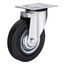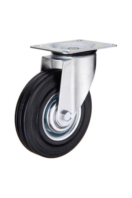 Применяется для транспортировки грузов средней степени тяжести. Колесо поворотной опоры оснащено роликовым подшипником. Данная серия колесных опор отлично адаптирована к эксплуатированию в помещениях и на грубой уличной поверхности. Обод поворотного колеса изготовлен из высокопрочной стали и оцинкован. Сама шина колеса выполнена из черной резины высокого качества, которая справляется с различными воздействиями внешней среды и поглощает вибрации и шум. Рекомендуемая скорость транспортировки груза на тележке с данным видом колес не более 4 км/ч. Заводской температурный режим для данной серии варьируется между -25С° и +50С°. В качестве крепления использована площадка. Используются для складских тележек, платформенных тележек, мусорных баков небольшой емкости, для строительных лесов, стеллажей, железной мебели.