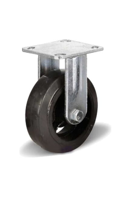 Большегрузные чугунные обрезиненные колеса с креплением площадочного типа неповоротные – устройства, предназначенные для работы в составе разнообразных передвижных конструкций и механизмов. Повышенная грузоподъемность обеспечивается за счет высокопрочного чугунного обода и шинки из качественной черной резины. Нагрузка за счет наличия подшипника распределена равномерно по всей оси. Для данной модели характерна прямолинейная траектория движения. Большегрузные колеса пригодны к эксплуатации как в помещении, так и под открытым небом при температуре от - 20° до + 60°. Используются так же как и промышленные (для складских тележек, платформенных тележек, мусорных баков небольшой емкости, для строительных лесов, стеллажей, железной мебели), только с увеличенной нагрузкой. Для больших мусорных контейнеров, для тяжелогрузных тележек для больших лесов.