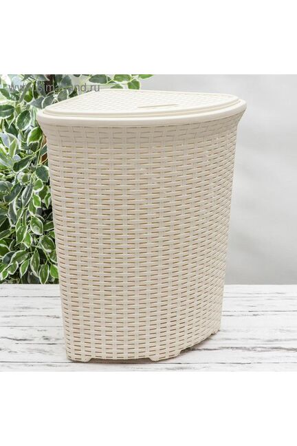 Размер (Д*Ш*В): 40*40*57 см Угловая корзина 60 л с крышкой, ротанг, прочный пластик, вентиляция, для белья и текстиля, компактное размещение, цвет слоновая кость.
