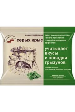 Приманка для быстрого и эффективного уничтожения крыс и мышей. Влагоустойчивая, простая в применении, безопасная при правильном использовании.