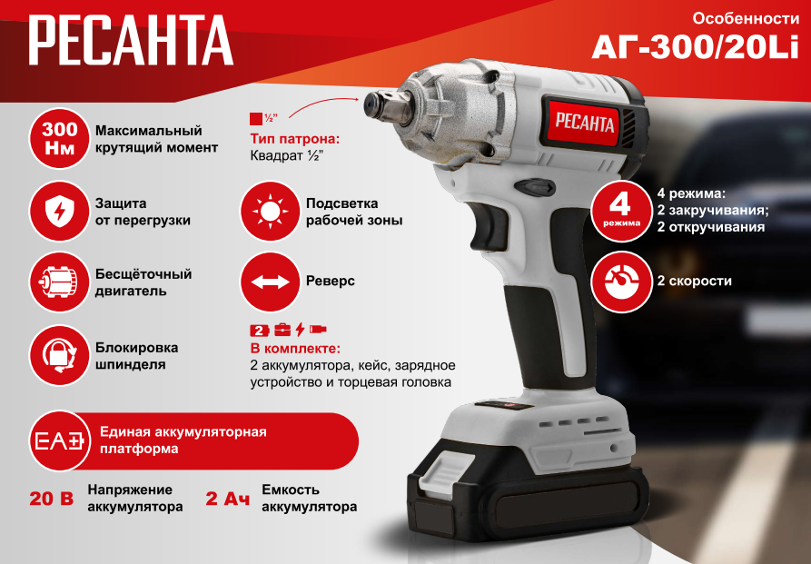 Гайковерт акк. РЕСАНТА АГ-300/20L 20В, 300 Нм, 2*2Ач, бесщеточный, кейс