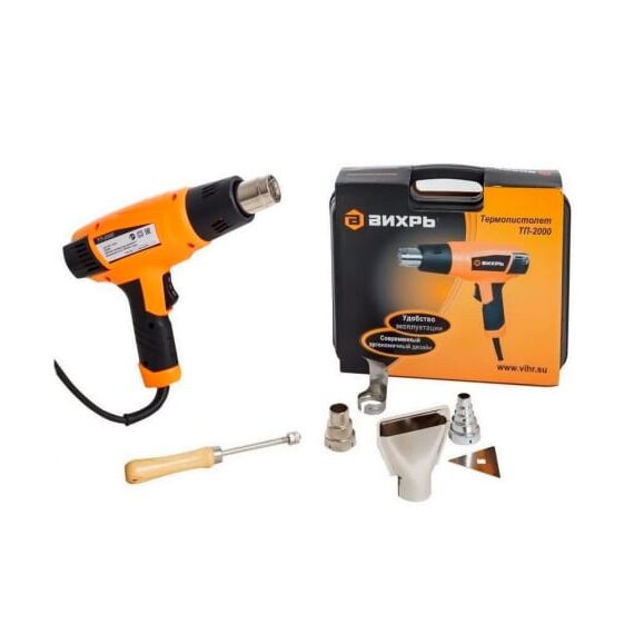 Термопистолет ВИХРЬ ТП-2000 используется при проведении строительно-отделочных работ для сушки и соединения твердых поверхностей. Инструмент работает от электросети (220/50). Строительный фен имеет два режима рабочей температуры: 400 и 550 С. Предусмотрено две ступени скорости воздушного потока: 300 и 500 л/мин. Рукоятка удобной формы обеспечивает удобное и надежное удержание инструмента в руке во время работы.