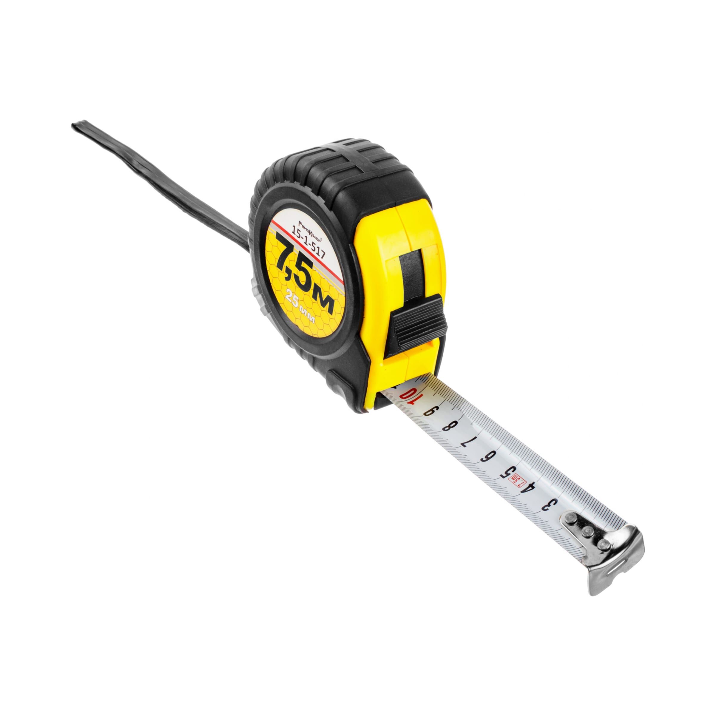Обрезиненный пластиковый корпус, холоднокатаная лента с трехслойным покрытием (краска, шкала, лак), возвратная пружина усиленного типа. Материал изготовления: ABS-пластик, сталь, вулканизированная резина Назначение: для определения размеров линейных объектов Рулетка 7,5м, ширина 25мм, надёжный корпус, чёткая шкала и автостоп — для точных, быстрых и удобных измерений при ремонте или строительстве.