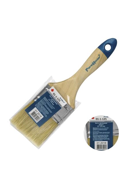 Натуральная светлая щетина. Предназначена для всех типов лакокрасочных материалов. Кончики щетины на конце расщеплены для лучшей впитываемости краски. Бандаж изготовлен из жести. Для надежного удержания щетины используется клей на эпоксидной основе и деревянные клинья. Рукоятка деревянная покрыта лаком. Кончик кисти окрашен цветной краской. Плоская кисть 63 мм с натуральной щетиной для ровного нанесения красок и лаков. Идеальна для отделочных и ремонтных работ разного масштаба.