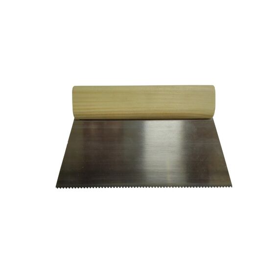 Шпатель А2 из нержавеющей стали с пластиковой ручкой предназначен для нанесения клея. Зубчатая лопатка 200 мм с удобной пластиковой ручкой для равномерного нанесения клея при облицовочных и отделочных работах.